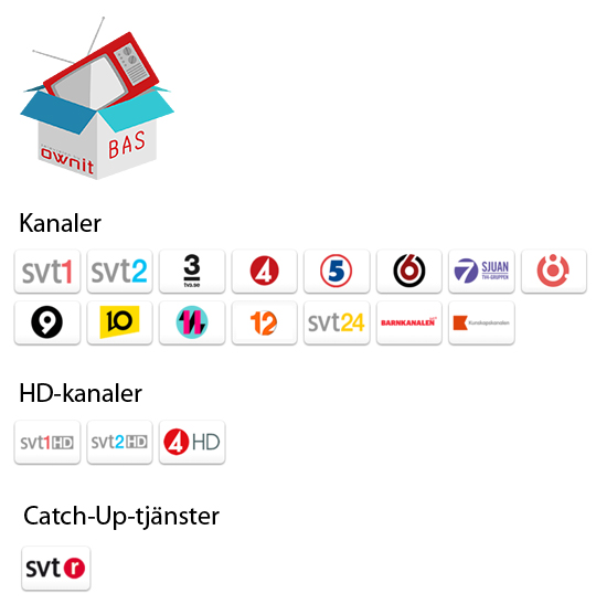 Det enklaste kanalpaketet BAS kostar 189 kr/mån och innehåller 15 av de mest populära TV kanalerna, plus 3 HD kanaler.