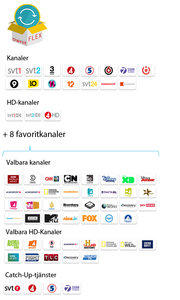 Vill du ha lite mer valmöjligheter rekommenderar vi att du lägger till FLEX-paketet där du, utöver basutbudet och för ett tillägg på 259 kr/mån får välja 8 egna favoritkanaler. Du har ingen uppsägningstid på FLEX och du kan ändra favoriter varje månad om du vill.