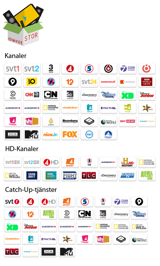 Med ett utbud på upp till 46 kanaler och ytterligare 16 i HD kan vi garantera att det finns något för alla, stora som små. Vi erbjuder 3 olika kanalpaket. BAS, FLEX och STOR. Du kan se nedan vilka kanaler som ingår i de olika paketen och vad de kostar.